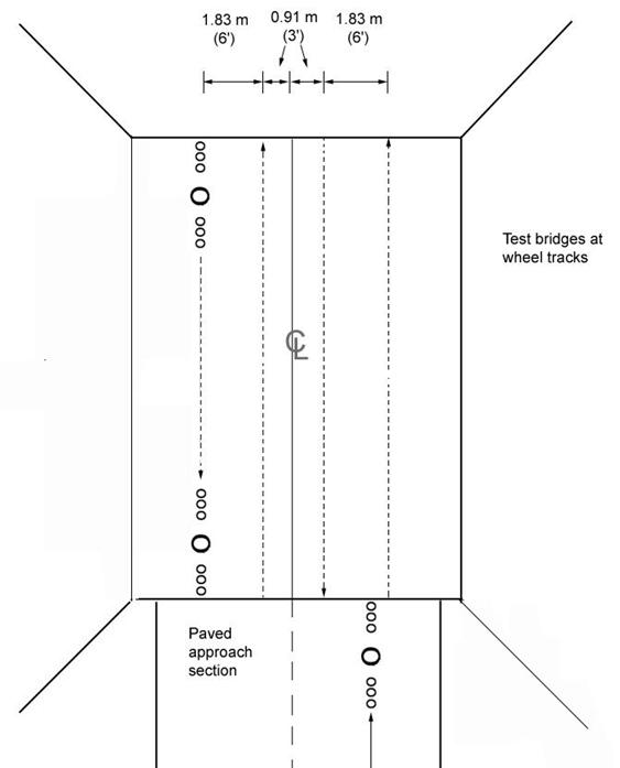 2) For wheel path testing, the center wheel shall be 3 feet and 9 feet from the centerline or lane line. See Figure 6.