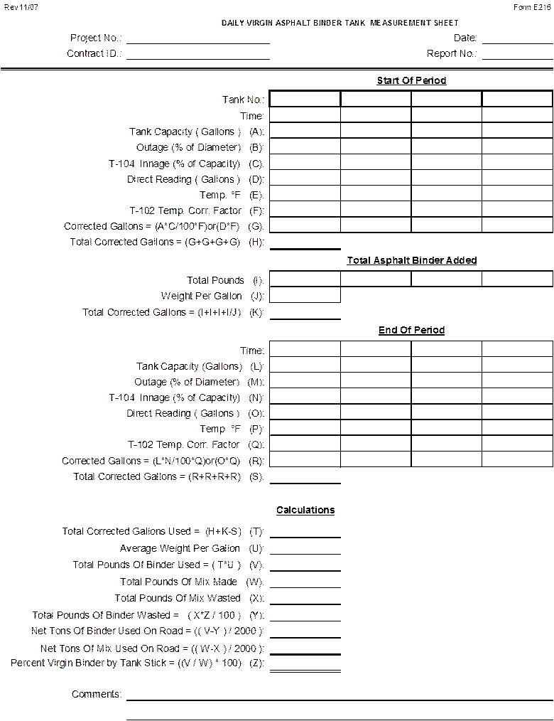 Enter the corrected gallons at 60°F for each tank being used by multiplying rows A, C, & F or D & F, depending on which method is used to measure the asphalt. Divide result by 100 when C is expressed as a whole number percent. This is the standard temperature at which pay quantities are determined.