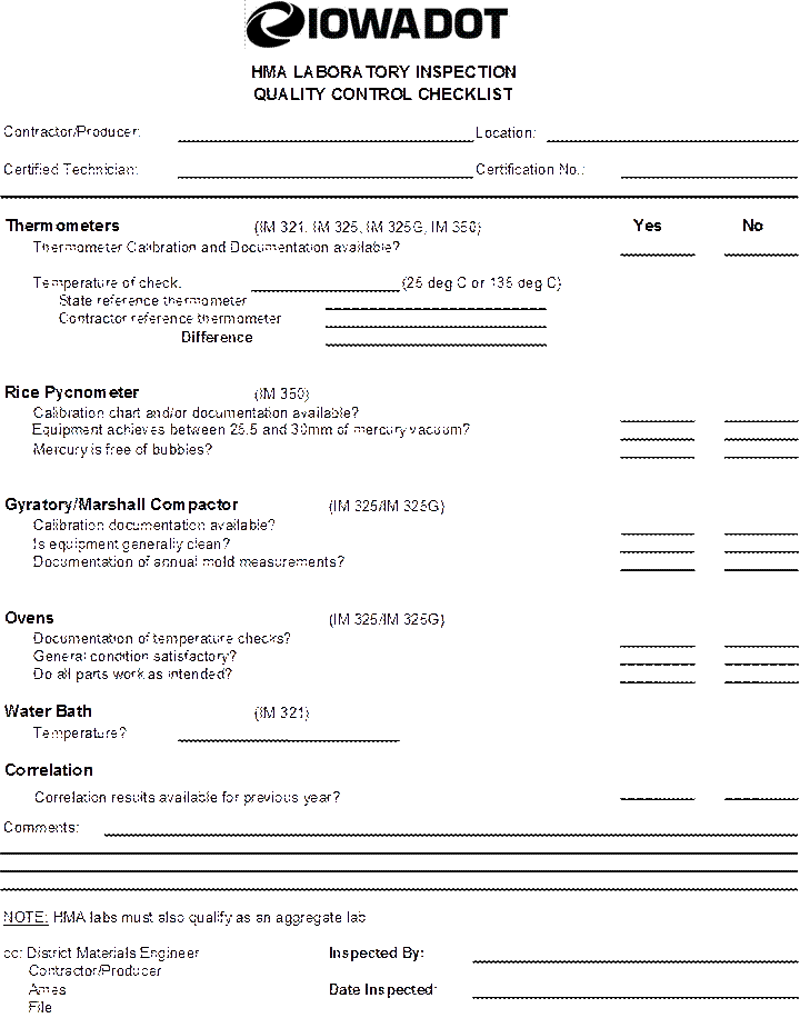The following list contains, as a minimum, what is required for a qualified asphalt laboratory. The test equipment to perform each of the required tests is contained in the respective IM.