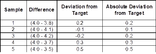 AAD is calculated by determining the absolute difference between the target and the individual test results and then averaging those values.