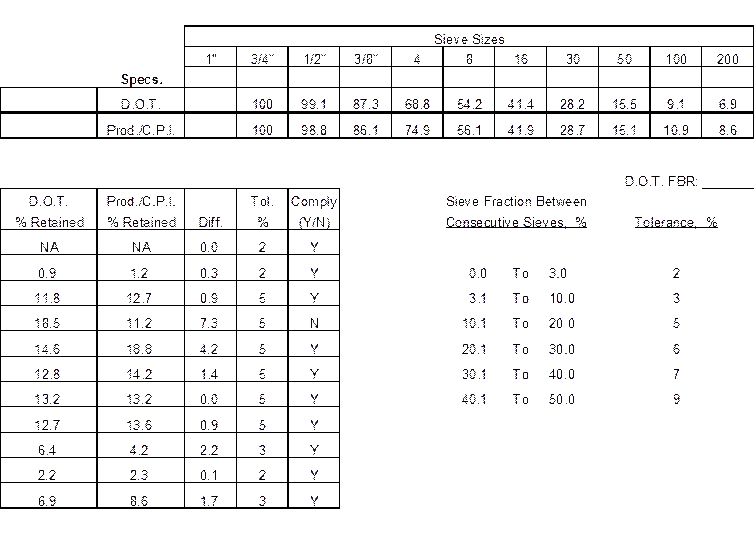 Use of these tolerances is explained in the following examples. Computer spreadsheets to perform the analysis are available on the Iowa DOT Materials Office website. Use of the spreadsheets is preferred when possible. Appendix A contains a copy of the printouts from the spreadsheets.