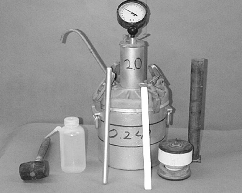 f. Make sure the calibration canisters have no water inside and that the bottom hole is clear of debris. Place the canister in the water making sure not to release air from the canister. Repeat step b and c. Close both petcocks and press down on the thumb lever exhausting air into the base. While holding the lever, lightly tap the gage to stabilize the dial reading. The dial should read the effective air volume of the canister (5.0% for air meters with a 0.25 ft3 volume).
