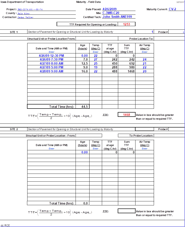 5. Plot the measured strength against the corresponding values of maturity at different ages, as determined by the maturity meter or by hand methods. Use the spreadsheet provided by the District Materials Concrete Technician to determine maturity-strength relationship. The maturity (TTF) value corresponding to the required opening strength shall be used to determine when the pavement or structure may be loaded. An example of the Maturity-Strength Development form, generated by the computer program, is included at the end of this IM. This form shall be reviewed by the DME. Copies will be provided to the Project Engineer, DME, Concrete Materials Engineer, and the contractor.