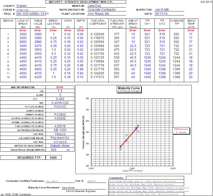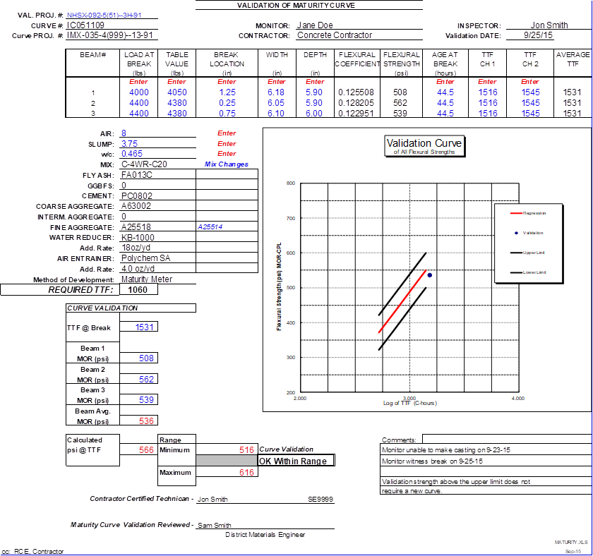 An example of the Validation of the Maturity Curve is included at the end of this IM. Copies shall be provided to the RCE, DME, and the contractor.