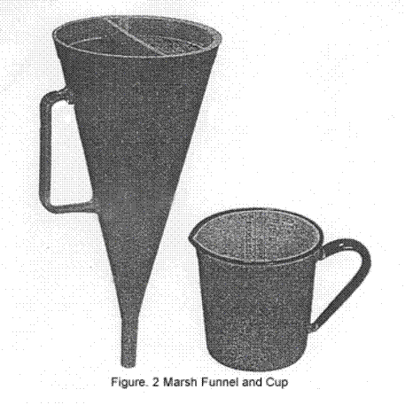 1. Marsh funnel: a marsh funnel (see Figure 2) is calibrated to out-flow 1 quart of fresh water at a temperature of 70°F ± 5°F in 26 seconds ± 0.5 seconds. A graduated cup is used as a receiver.