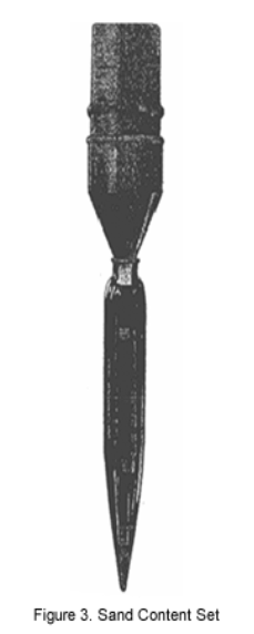 3. Glass measuring tube marked for the volume of slurry to be added. The tube is graduated from 0% to 20% in order to read the percentage of sand directly.