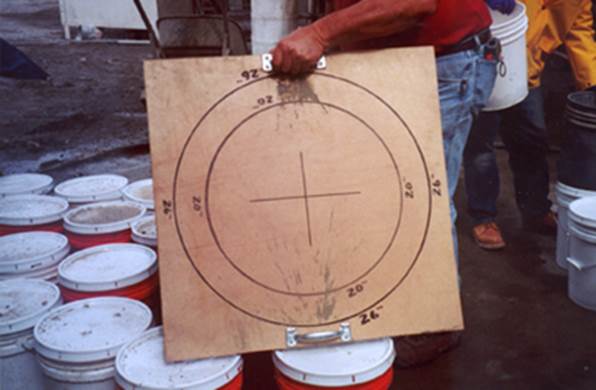 5. Flow Board. A ¾” plywood board, construction form board (or other stiff, flat, smooth material) cut 32” X 32” with surface sealed to have a non-absorbent face. Draw two centerlines on the board and two concentric circles, the first circle has a diameter of 20 inches. The second circle has a larger diameter, which may be 26 inches in diameter. (Figure 1)