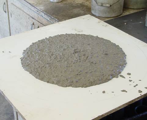 No mortar halo or aggregate pile in the slump flow patty but some slight bleed or air popping on the surface of the concrete in the wheelbarrow or container. |
