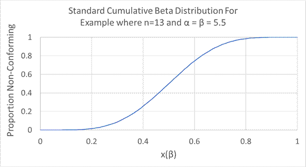 This figure represents the cumulative Beta Distribution function for the example. NOTE: This distribution will change for lots with different sample sizes.
