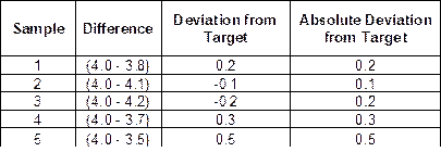 AAD is calculated by determining the absolute difference between the target and the individual test results and then averaging those values.
