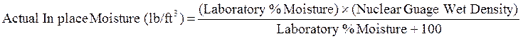 Compute the average of the actual in-place moisture contents for the paired tests and compute the average of the nuclear gauge moisture readings for the same moisture sample locations. Then compute the correction factor using the following equation.